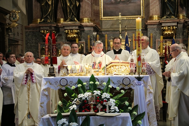 Witając biskupów, księży i wiernych ks. prał. Jacek Plota, kustosz Narodowego Sanktuarium św. Józefa w Kaliszu zaznaczył, że modlitwie towarzyszą relikwie polskich męczenników II wojny światowej, m.in.: św. o. Maksymiliana Marii Kolbego, bł. ks. Wincentego Frelichowskiego, bł. ks. Józefa Stanka Pallotyna. Dodał, że w 2010 r. abp Józef Michalik ofiarował kaliskiej bazylice Księgę Upamiętniającą Kapłanów, którzy zginęli w czasie II wojny światowej. Są tylko dwie takie księgi. Jedna znajduje się na Jasnej Górze, a druga u św. Józefa w Kaliszu. - My wszyscy chrześcijanie i Polacy, a zwłaszcza kapłani jesteśmy wdzięczni za złożoną ofiarę cierpienia i życia kapłanów męczenników z Dachau, ponieważ oni cierpieli, a połowa z nich oddała swe życie za wolność Kościoła i Ojczyzny. Ich ofiara została przyjęta. Mamy w Polsce wolność Kościoła i Ojczyzny i dlatego co roku gromadzimy się na modlitwie dziękczynnej w Narodowym Sanktuarium Św. Józefa, by modlić się za Kościół i Ojczyznę przywołując męczenników, a za zmarłych prosząc o dar nieba – powiedział kustosz kaliskiej bazyliki.