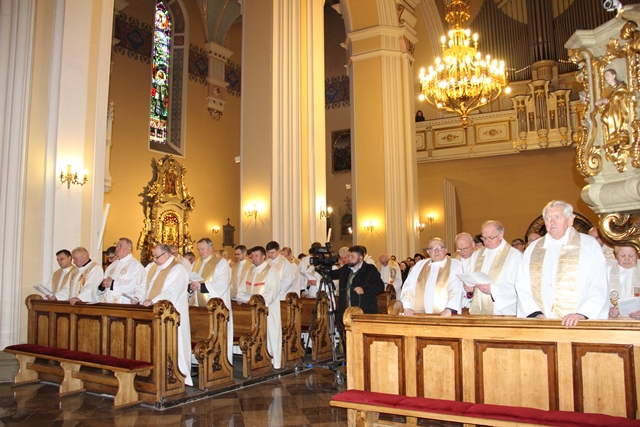 Na początku Eucharystii ks. prał. Adam Modliński powitał biskupów i kapłanów. Przypomniał, że w tym roku diecezja kaliska świętuje jubileusz 25-lecia powstania. – Wczoraj, 12 kwietnia, minęło 25 lat od uroczystego ingresu pierwszego biskupa kaliskiego do katedry – powiedział proboszcz katedry. Dodał, że od 1992 r. dla diecezji kaliskiej wyświęcono 305 kapłanów. Wspomniał też zmarłych księży. Zaznaczył, że w ciągu 25 lat istnienia diecezji kaliskiej odeszło do Pana 169 kapłanów. Pozdrowił również jubilatów obchodzących 60., 50. i 25. rocznicę święceń kapłańskich. Zaznaczył, że księża zgromadzeni w kaliskiej katedrze łączą się duchowo z kapłanami przebywającymi poza granicami kraju.