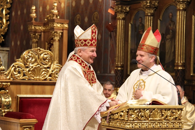Przed błogosławieństwem życzenia bp. Edwardowi Janiakowi w imieniu biskupów i księży złożył bp Łukasz Buzun, biskup pomocniczy diecezji kaliskiej. – Chrystus jest dla Ciebie wzorem dobrego pasterza i dobrego kapłana. Chciałbym w imieniu wszystkich kapłanów podziękować za Twój trud i służbę w diecezji oraz życzyć radości, siły, mocy wewnętrznej, pokoju w sercu płynących z pewności wiary w Chrystusa Zmartwychwstałego – mówił bp Buzun. Były także życzenia od sióstr zakonnych i kleryków. Mszę św. Krzyżma wraz z bp. Edwardem Janiakiem koncelebrowali: bp Łukasz Buzun, bp senior Stanisław Napierała, bp senior Teofil Wilski, ks. prał. Andrzej Latoń i licznie zgromadzeni kapłani diecezji kaliskiej.