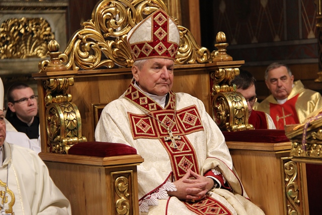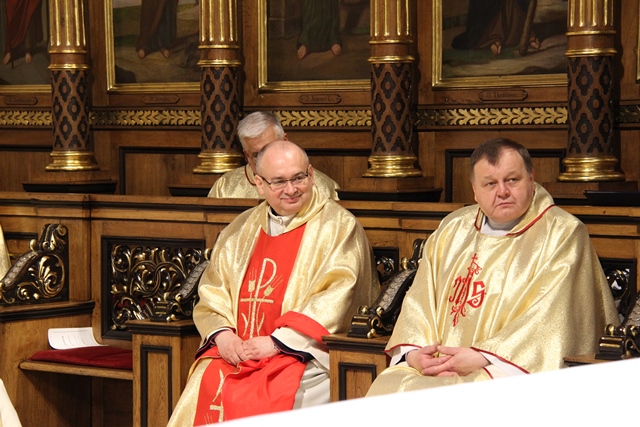 W homilii biskup kaliski zachęcał duchownych do odkrywania na nowo swojego kapłaństwa. – W roku jubileuszowym 25-lecia istnienia diecezji kaliskiej staramy się na nowo odkryć tożsamość kapłańską, aby jeszcze gorliwej pracować w winnicy Pańskiej. Wewnętrzna formacja kapłańska z natury rzeczy nastawiona jest na ciągły rozwój i wzrost – mówił celebrans. Podkreślał, że kapłani poprzez Słowo Boże, sakramenty święte i ewangelizację budują Kościół święty, który jest komunią, a nie organizacją użyteczności publicznej. – Niestety, wielu publicystów wypowiadających się na łamach prasy na temat Kościoła, chciałoby go sprowadzić tylko do jakiejś organizacji charytatywnej lub filantropijnej – powiedział kaznodzieja. Dodał, że akcja charytatywna to tylko jeden z aspektów działalności Kościoła, ważny, ale nie najważniejszy. – Zadaniem Kościoła jest misja zbawienia człowieka i w tę misję musi być wpisane nasze kapłaństwo – stwierdził bp Janiak. Zaznaczył, że współczesny świat jest dotknięty laicyzmem, który eliminuje z życia człowieka obecność Boga, wartości nadprzyrodzone i moralne kryteria oceny postępowania ludzi. – Z drugiej strony mamy do czynienia z fundamentalizmem religijnym, który prześladuje i morduje w imię religii, w imię Boga, co jest niezgodne z elementarnym poczuciem zdrowej religijności. W tę optykę współczesnej cywilizacji i globalizacji wrzucony jest kapłan, aby mimo wszystkich przeszkód głosił Dobrą Nowinę o zbawieniu – wskazywał hierarcha. Prosił wiernych o modlitwę w intencji księży. – Zwracam się do Was, drodzy wierni, abyście swoją modlitwą wspierali swoich duszpasterzy. Przez dobrą i harmonijną współpracę można dokonać wiele szlachetnych dzieł w parafiach, do których należycie. Niech Wasza dyspozycyjność będzie zachętą dla kapłanów, by jeszcze gorliwiej pracowali dla zbawienia dusz – mówił ordynariusz kaliski. Podziękował księżom za posługę w diecezji kaliskiej. – Chciałbym Wam serdecznie podziękować za Waszą pracę dla dobra Kościoła Kaliskiego. Ten Kościół jest Waszą matką, a matkę trzeba kochać i wiernie jej służyć – powiedział bp Janiak. W czasie uroczystej liturgii biskup kaliski poświęcił krzyżmo oraz oleje chorych i katechumenów.