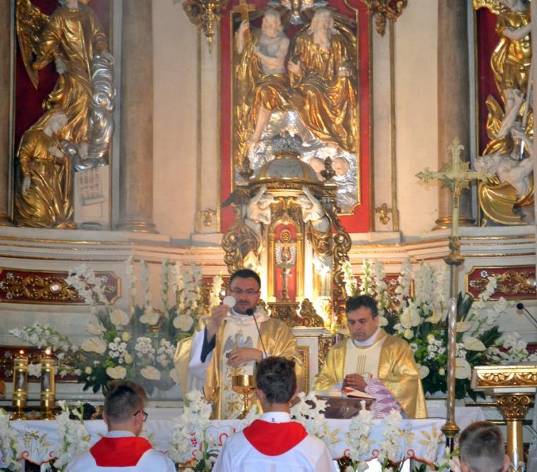 Kontynuując rozważanie ks. kan. podkreślił, że pierwszym celem liturgii jest uwielbienie Boga. Zwrócił także uwagę na zanik sacrum w życiu współczesnego człowieka, co prowadzi do tego, świat szybciej się sekularyzuje niż Kościół go ewangelizuje. Nawiązując do obchodzonego w tym roku 100- lecia objawień fatimskich ks. kan. Krzysztof powiedział: „…warto zatrzymać się nad treścią modlitwy anioła z Fatimy: „ O mój Boże, wierzę w Ciebie, uwielbiam Cię, kocham, Cię, ufam Tobie…”. W dalszej części kaznodzieja zwrócił uwagę na przywrócenie sacrum w dwóch wymiarach: doświadczenia wewnętrznego, ale także w wymiarze zewnętrznym czyli dotyczącym naszej postawy, gestów, staranności z jaką je wykonujemy. Kaznodzieja zachęcił zebranych do swoistego rachunku sumienia, do postawienia sobie osobiście pytania o to jak traktujemy Ciało Pańskie. Zapytał mi. in. o to czy przyklękamy przed tabernakulum, jak się zachowujemy, jaka przyjmujemy postawę mijając kapłana idącego z Najświętszym Sakramentem do chorych. Kontynuując pytał: Klęczysz czy kucasz? Gdzie w Piśmie Świętym jest napisane kucnij przed Panem”. Przywołał słowa św. Pawła mówiące „ Na imię Jezusa zegnie się każde kolano istot niebieskich i ziemskich i podziemnych”. Kaznodzieja zwrócił uwagę, że już podczas procesji eucharystycznej możemy zmienić swoją postawę i zgiąć kolana przed wychodzącym na nasze ulice Panem. Wiele ważnych słów padło w tej homilii. Trzeba mieć nadzieje, że pobudziły one uczestniczących w uroczystej sumie wiernych do refleksji, a w konsekwencji do podjęcia kroków mających na celu przywrócenia sacrum w naszym życiu.