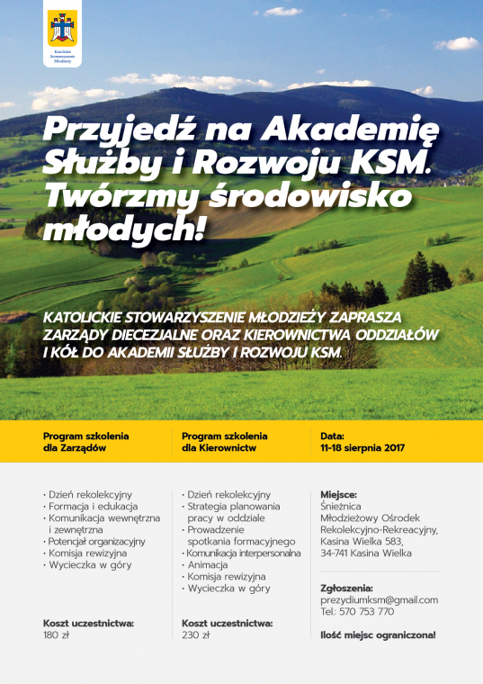 Zgłoszenia przyjmuje Biuro Prezydium Katolickiego Stowarzyszenia Młodzieży (e-mail: prezydiumksm@gmail.com, tel. 570753770).