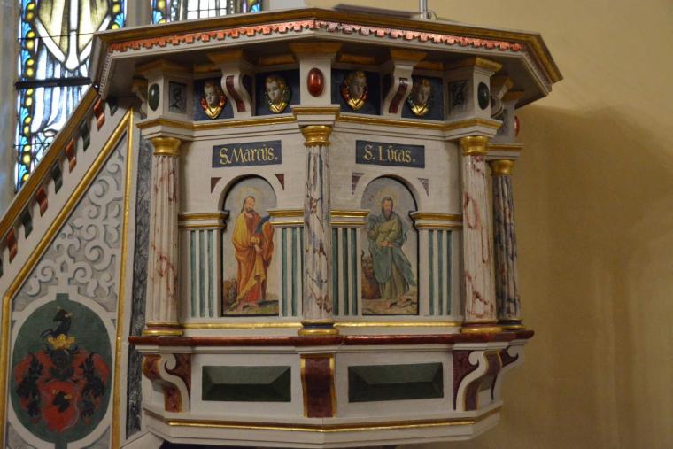 Po zamknięciu skrzydeł bocznych przed oczami modlących jawią się dwie postaci naturalnej wielkości namalowane na desce: Matka Boża Bolesna i Jezus ubiczowany. Zwieńczeniem górnej części ołtarza jest scena pasyjna – Maryja trzyma na rękach ciało umęczonego Syna (pieta). Na uwagę zasługuje też piękna ambona z wizerunkami ewangelistów.
