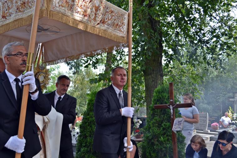 Po mszy św. Ks. Biskup odczytał litanię do św. Rocha. Następnie procesja z Najświętszym Sakramentem przeszła cmentarnymi alejkami. Błogosławieństwo Najświętszym Sakramentem zakończyło uroczystą sumę odpustową. Zgodnie z tradycją po Mszy św. wierni zabierali do domów małe chlebki, by podzielić się nimi z bliskimi. Przy rozdawaniu chlebków pomagali uczestnicy spotkań w Szkole św. Rocha oraz dziewczęta z Eucharystycznego Ruchu Młodych.