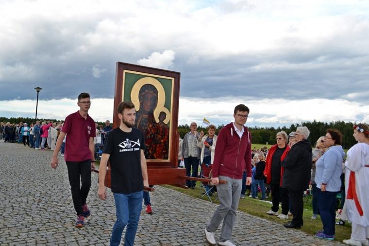 O godz. 15:00 uczestnicy  spotkali się na Koronce do Miłosierdzia Bożego. Czekała na niech miła niespodzianka. Na Pola Lednickie przybył  Prymas Polski abp Wojciech Polak powitany serdecznie przez zgromadzonych. W trakcie odmawiania Koronki do Miłosierdzia Bożego wniesiony został procesjonalnie obraz Jezusa Miłosiernego. Przed Adoracją Najświętszego Sakramentu zostały zaprezentowane dwie inscenizacje biblijne: „Rola Maryi – Maryja wyprowadza nas z ukrycia” oraz „Ty jesteś Zacheuszem – Pragnij i zaryzykuj”. Po inscenizacjach i modlitwie wstawienniczej siostry zakonne wypowiadając imiona poszczególnych uczestników spotkania wykonywał znak krzyża na ich czole i wypowiadały słowa „Idź i kochaj”. Te słowa stanowiły przesłanie i hasło tegorocznej Lednicy, a jednocześnie uświadomiły  nam, że każdy z nas posłany  i powołany jest do tego, by nieść miłość. Następnie wniesiona została figura Matki Bożej Fatimskiej, której towarzyszyli pastuszkowie. Na Lednickich Polach nie mogło zabraknąć obrazu Czarnej Madonny. Wprowadzeniu figury i obrazu towarzyszyła modlitwa różańcowa. Ważnym elementem spotkania było wniesienie pustej ramy i gest pustej ramki. Z wielkim wzruszeniem zebrani na Lednicy wysłuchali świadectwa przedstawicieli Wspólnoty Betlejem. Przyjechali na spotkanie małymi traktorami, by zwrócić uwagę na potrzebę życzliwości i przebaczenia w życiu. Pięknym doświadczeniem podczas  lednickiego spotkania była adoracja Najświętszego Sakramentu. Gdy wystawiony został Najświętszy Sakrament zapanowała cisza, w milczenie zebrani adorowali Jezusa ukrytego w Najświętszym Sakramencie.Następnie odczytany został Akt Wyboru Chrystusa, w zebrani przeszli przez Bramę III Tysiąclecia.