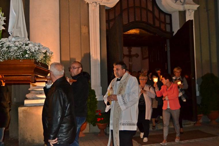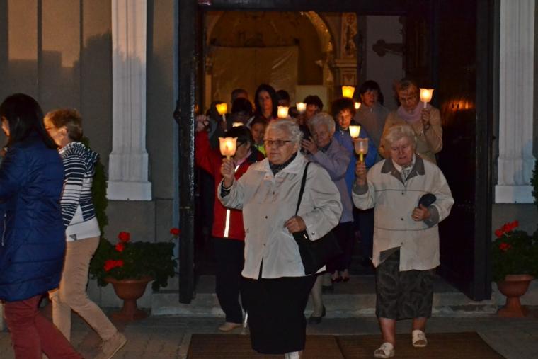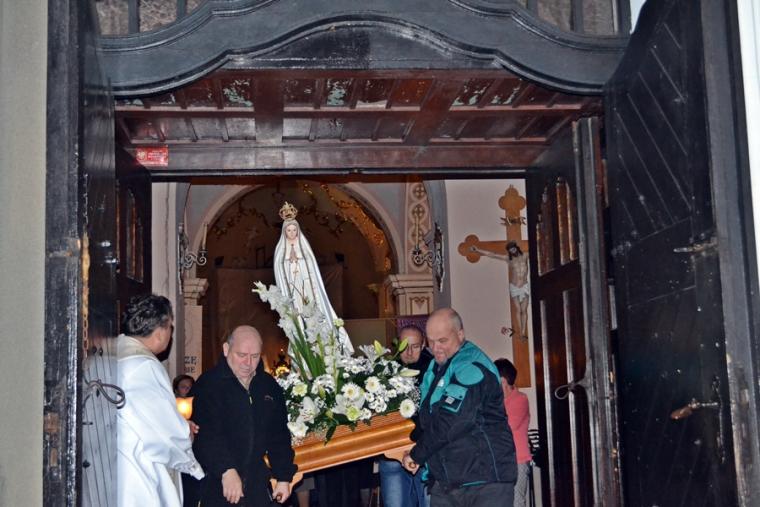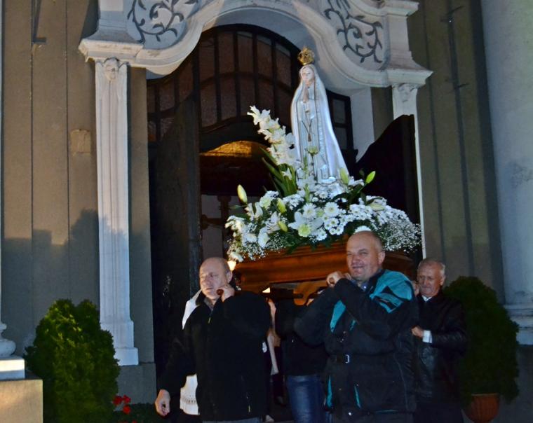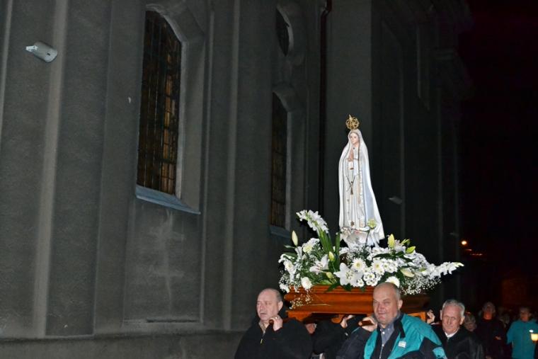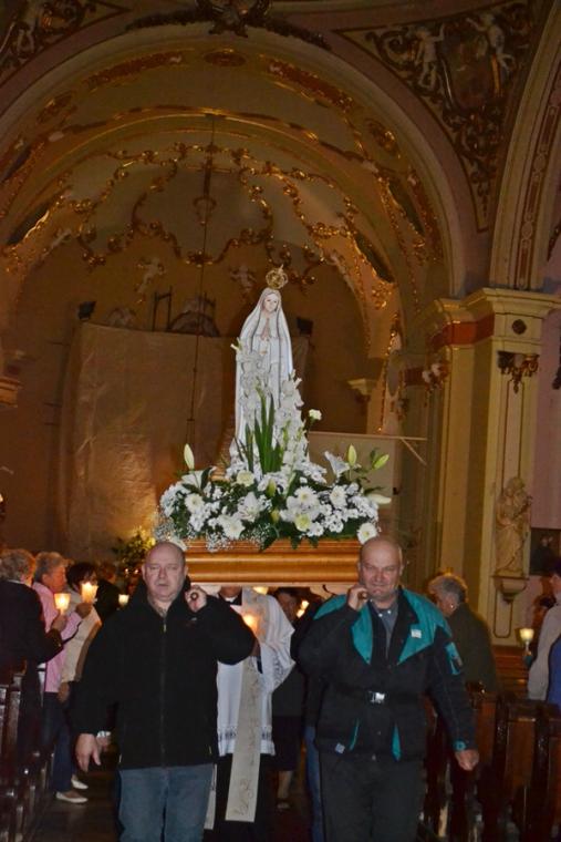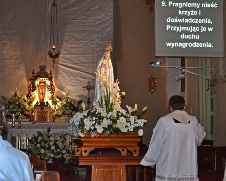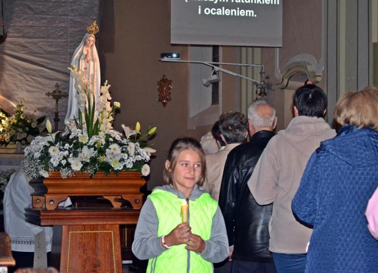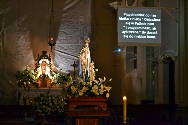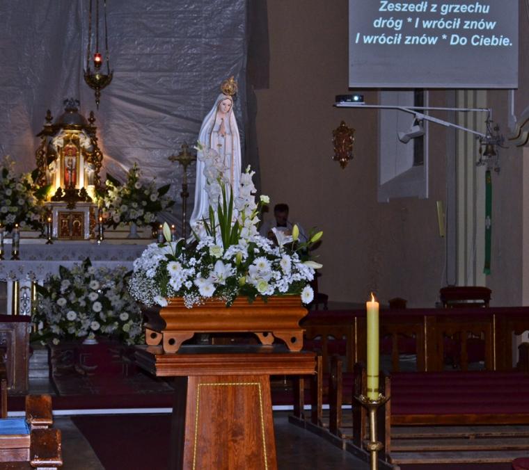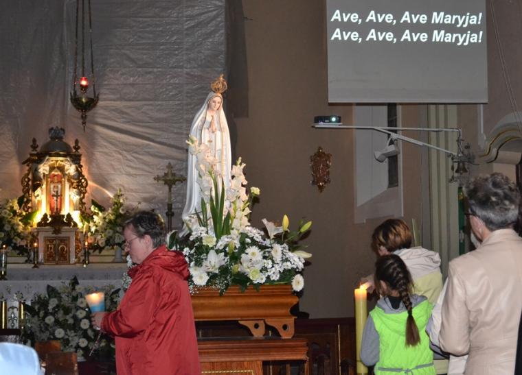 Kolejne postanowienia dotyczyły codziennej modlitwy do Ducha Świętego, a także obrania Maryi za Królową naszych serc. Podczas odmawiania piątej tajemnicy w świątyni zapłonęły lampiony przyniesione przez wiernych. Zostały one zapalone od świecy jubileuszowej stojącej przy figurze Fatimskiej Pani. Następnie odmówiliśmy modlitwę Anioła i ze śpiewem na ustach z zapalonymi lampionami wyruszyliśmy figurą Fatimskiej Pani z procesją wokoło kościoła. W tym czasie rozległ się dźwięk dzwonów, który przypomina nam o tym, by stanąć do Apelu Jasnogórskiego. Towarzyszy nam on od czasu nawiedzenia naszej parafii przez Czarną Madonnę w 2011 roku. Po powrocie do kościoła został odśpiewany Apel Jasnogórski . Maryjo: jesteśmy, pamiętamy, czuwamy- to wyznanie popłynęło ku niebu z naszego parafialnego wieczernika. Modlitwą w ten wieczór objęliśmy także zgromadzonych w polskiej Fatimie na zakopiańskich Krzeptówkach Kustoszy Sanktuariów i uczestników Międzynarodowego Kongresu Maryjno- Mariologicznego.