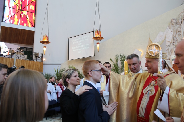 Zwracając się do młodzieży mającej przyjąć sakrament bierzmowania duchowny prosił ich, aby nigdy Chrystusa nie zdradzili i nie odeszli od Jego Kościoła. - Możemy korzystać z Bożego Miłosierdzia, a jeśli komuś brakowałby tego włożenia palca jak Tomaszowi, niech zaufa Panu Bogu z odwagą. Wątpić w Boga nie jest grzechem kiedy człowiek szuka, ale tkwić w grzechu to jest przeciw Panu Bogu. Niech to zesłanie Ducha Świętego umacnia was do odważnego dawania świadectwa miłości do Pana Boga i człowieka – mówił bp Janiak.