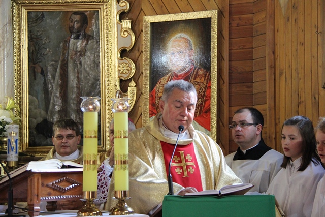 Dziękował wiernym za troskę o świątynię. - Na Kościół trzeba patrzeć przez pryzmat własnego księdza proboszcza. Kardynał Wyszyński mawiał, że obraz Kościoła nie jest taki jak go widzimy w wielkich miastach, ale trzeba iść do najmniejszych wspólnot parafialnych. Jest was niewielu, ale z wielką troską dbacie o dom Boży. To jest piękne, że następnemu pokoleniu przekażecie kościół zadbany, który świadczyć będzie o mieszkającej tutaj wspólnocie. Ta świątynia jest wyrazem waszego szacunku dla Pana Boga – stwierdził bp Janiak.