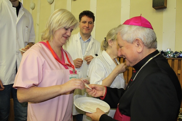 Biskup odwiedził pacjentów oddziału chirurgii ogólnej i przewodu pokarmowego, a pozostali kapłani przełamali się opłatkiem z chorymi leżącymi na wszystkich oddziałach kaliskiego szpitala.