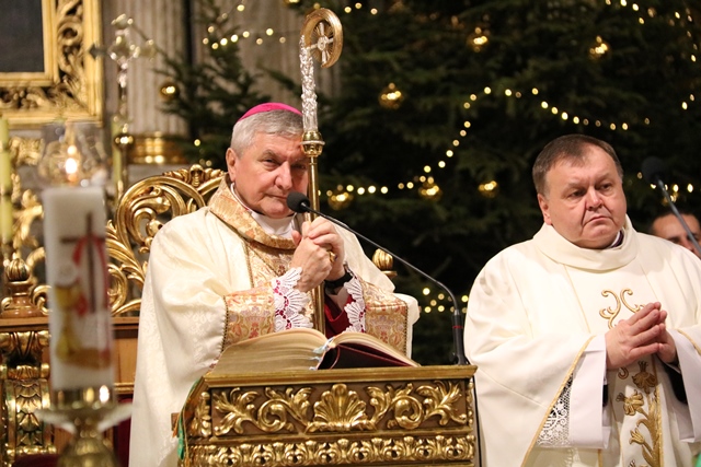Wskazywał, że Jezus przychodząc na ziemię przebóstwił człowieczeństwo i dlatego każdemu człowiekowi należy się szacunek. - Ta dzisiejsza noc jest nocą miłości Boga do człowieka. Każdemu człowiekowi należny jest szacunek, dobre słowo, uśmiech, a czasem też trzeba podzielić się chlebem – mówił bp Janiak.