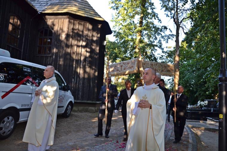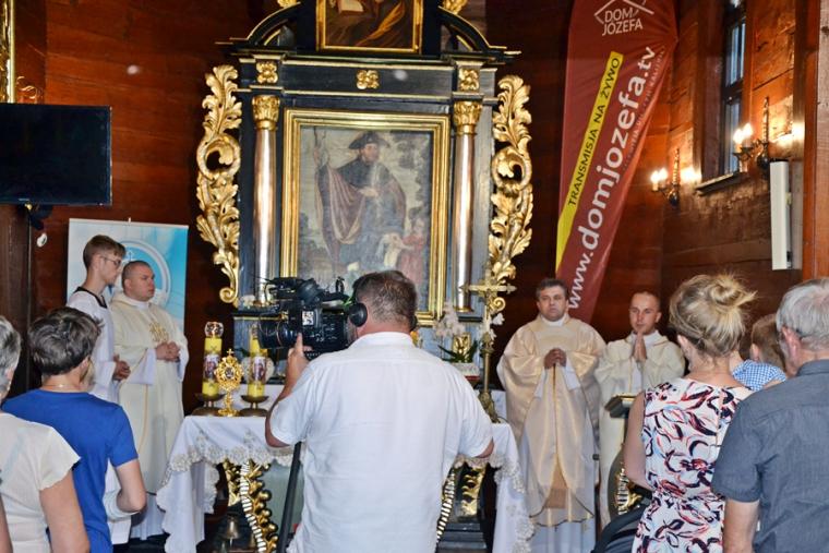 Jest tradycją w mikstackiej wspólnocie parafialnej, że w poniedziałki w Diecezjalnym Sanktuarium Świętego Rocha sprawowana jest msza święta, a po niej nabożeństwo do św. Rocha. Uczestniczy w nim wielu parafian. W poniedziałek, 24 czerwca było ich znacznie więcej. Nie wszyscy uczestniczyli w nim bezpośrednio, ale wielu włączyło się w nie duchowo, gdyż w tym dniu w ramach czwartych poniedziałków miesiąca przeprowadzona została na żywo transmisja radiowo- telewizyjna przez Radio Rodzina i TV Internetową Dom Józefa. Gościliśmy w tym dniu w sanktuarium Dyrektora Diecezjalnego Radia Rodzina i TV Internetowej Dom Józefa ks. Mateusza Puchałę, pochodzącego z naszej parafii. Wraz z ks. Mateuszem przybył ks. Szymon Rybak, który był w naszym sanktuarium po raz pierwszy i pewnie nie ostatni, bo tak jak wielu je nawiedzających i on nie oparł się jego urokowi. Mszy świętej przewodniczył kustosz miejsca ks. kan. Krzysztof Ordziniak, który polecał pracowników naszych mediów, prosił dla nich o światło Ducha Świętego. Wraz z ks. kustoszem przy ołtarzu stanęli ks. Mateusz, ks. Szymon i ks. wikariusz Marcin Walczak, którzy polecali Bożemu miłosierdzi zmarłych z naszej parafii.