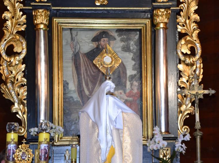 Przy wystawionym Najświętszym Sakramencie zostało odprawione nabożeństwo do św. Rocha. Odbywa się ono w Diecezjalnym Sanktuarium Świętego Rocha w każdy poniedziałek. Tym razem uczestniczyli w nim nie tylko mikstaccy parafianie i pielgrzymi, ale także słuchacze RR i TV Dom Józefa. Może zechcą kiedyś przyjechać do Mikstatu i włączyć się już bezpośrednio w wołanie ku niebu: Święty Rochu, bądź przy nas i wspieraj nas, w niewielkim rozmiarami, ale wielkim duchem sanktuarium. Po „Rochowym nabożeństwie” odmówiona została Litania do Najświętszego Serca Jezusowego. Trwamy w okresie tzw. oktawy Bożego Ciała więc po odmówieniu litanii wyruszyliśmy w procesji wokoło sanktuarium. Błogosławieństwo Najświętszym Sakramentem zakończyło modlitewne spotkanie w sanktuarium.Wielu uczestników modlitewnego spotkania uczciło relikwie ,św. Rocha. Wszyscy otrzymali folder, na którym znajdują się informacje o częstotliwości nadawania Radia Rodzina i adres internetowy TV DOM JÓZEFA.