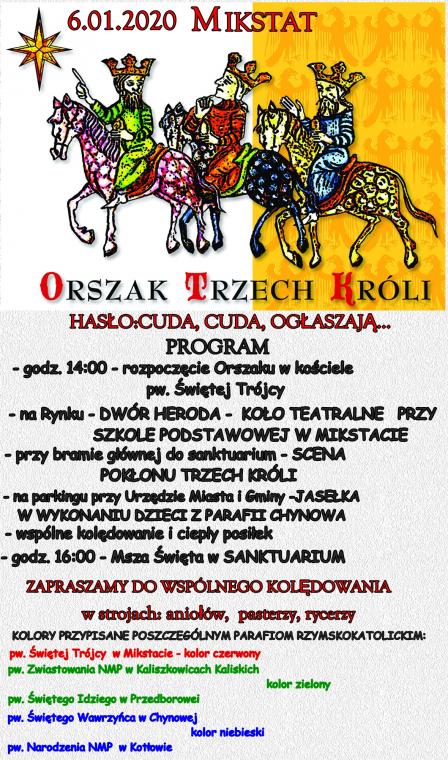 Od kilkunastu lat w uroczystość Objawienia Pańskiego, popularnie nazywaną świętem Trzech Króli na ulicach miast, miasteczek i wiosek odbywają się największe jasełka – Orszak Trzech Króli. W ubiegłym roku przeszedł on po raz pierwszy ulicami Mikstatu, ale co warto podkreślić miał on charakter „ prawie dekanalny”, gdyż uczestniczyli w nim wraz ze swoimi w nim wraz ze swoimi duszpasterzami wierni z parafii z Chynowej, Kaliszkowic Kaliskich, Kotłowa, Przedborowa i oczywiście Mikstatu. Liczny udział wiernych i pozytywne opinie o tym wydarzeniu sprawiły, że było wiadomo, że za rok 6. stycznia 2020 roku zostanie zorganizowany kolejny Orszak Trzech Króli. I będzie … Tegoroczny OTK przebiegać będzie pod hasłem: „Cuda, cuda, ogłaszają…”. Koordynatorem działań związanych z organizacją Orszaku był dziekan dekanatu mikstackiego, ks. kan. Krzysztof Ordziniak. Orszak wyruszy o godz. 14:00 z kościoła farnego pw. Świętej Trójcy w Mikstacie, a zakończy się na parkingu przy Urzędzie Miasta i Gminy. Zatrzyma się na Rynku, gdzie zostanie zaprezentowana scena Heroda przygotowana przez koło teatralne działające przy szkole podstawowej w Mikstacie. Następnie uliczkami miasta będzie zmierzał w kierunku Diecezjalnego Sanktuarium Świętego Rocha. Tu przed bramą główną uczestnicy Orszaku będą mogli zobaczyć scenkę pokłonu Trzech Króli Dzieciątku. Spod bramy prowadzącej do sanktuarium Królewski Orszak skieruje się w kierunku parkingu. Tu będzie można podziwiać jasełka przygotowane przez dzieci z parafii w Chynowej. Jak wspomnieliśmy, mikstacki Orszak ma charakter dekanalny. Chodzi w nim także o to, by poszczególne parafia miały możliwość zaprezentowania się. W ubiegłym roku mogliśmy obejrzeć piękne jasełka przygotowane przez dzieci z Kaliszkowic. W kolejnych latach przyjdzie czas na zaprezentowanie się przez kolejne parafie. Podczas przejścia Orszaku z kościoła farnego na parking będzie sporo czasu, by włączyć się w śpiew tak przez nas lubianych kolęd i pastorałek. Każdy uczestnik otrzyma koronę i śpiewnik. Warto więc już dziś zarezerwować sobie czas na udział w tych niezwykłych jasełkach, w których jesteśmy nie tylko widzami, ale i ich uczestnikami. Udział w jasełkach jest ważnym wydarzeniem religijnym, okazją do wyznania wiary, ale także rodzinnym. Mamy nadzieję, że tak jak w ubiegłym roku w OTK wędrować będą aniołki, pasterze, rycerze. Jak pokazał ubiegłoroczny Orszak uczestniczyły w nim całe rodziny. Stał się on więc okazją do wspólnego, radosnego świętowania. Mikstacki Orszak integruje nie tylko rodziny, ale i parafie należące do dekanatu. Staje się okazją do lepszego poznania się, ale i zaprezentowania własnych osiągnięć. Na parkingu, przy urzędzie będzie czas na dalsze wspólne kolędowanie i gorący posiłek.Będzie też okazja do nawiedzenia niewielkiego rozmiarami, ale wielkiego duchem Diecezjalnego Sanktuarium Świętego Rocha. Tu o godz. 16:00 będzie sprawowana Msza Święta. Do zobaczenia 6. stycznia...