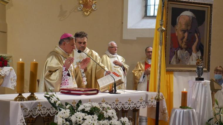 13 czerwca odbyła się w Mikstacie uroczystość przekazania przez Abpa Mieczysława Mokrzyckiego, wieloletniego osobistego sekretarza dwóch papieży, relikwii św. Jana Pawła II. Przekazując relikwie ks. proboszczowi Krzysztofowi Ordziniakowi ks. Abp powiedział: „Księże proboszczu, przyjmij tę relikwię i otaczaj ją należytą czcią i przekazuj do czczenia wiernym. Niech wszyscy modlący się przed tymi relikwiami za wstawiennictwem św. Jana Pawła II otrzymują obfitość łask i niech Go naśladują w wierze i miłości”. Następnie słowa powitania zostały wypowiedziane przez przedstawicieli parafian. Ks. proboszcz przypomniał inicjatywy podjęte w parafii, które doprowadziły do tej radosnej chwili przekazania relikwii. Podkreślił, że w znaku relikwii chcemy uczcić i powitać św. Jana Pawła II jako opiekuna i orędownika, ale także pogłębić więź modlitewną, przekazać dziedzictwo, które nam pozostawił kolejnym pokoleniom. Zwracając się do Ks. Abp Mieczysława Mokrzyckiego ks. proboszcz zaakcentował, że przybywa z dalekiego Lwowa, aby przekazać nam relikwie św. Jana Pawła II oraz wzmocnić naszą wiarę świadectwem swego życia. Następnie ks. kan. Krzysztof skierował słowa powitania do wszystkich uczestników uroczystości, dziękując tym, którzy przyczynili się do tego, że mogła się ona odbyć. Ks. proboszcz poprosił Hierarchę o przewodniczenie Eucharystii i sprawowanie jej w intencji wszystkich parafian.