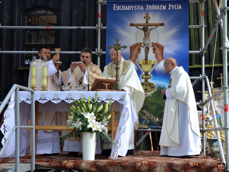Msza Święta koncelebrowana rozpoczęła się przy ołtarzu polowym przy sanktuarium o godz. 18:30. Przewodniczył jej ks. proboszcz Krzysztof Ordziniak. Wraz z nim przy ołtarzu stanęli ks. kan. Andrzej Grabański, ks. kan. Grzegorz Ignor i  ks. wikariusz Marcin Walczak. Rozpoczynając Eucharystię ks. kan. Krzysztof zaznaczył, że w Najświętszej Eucharystii zawiera się całe dobro duchowe Kościoła. Sprawia to, że człowiek wierzący pragnie spotykać się ze swoim Panem. Zaakcentował, że dobrze, że tradycją jest, że zakończenie oktawy Bożego Ciała odbywa się przy sanktuarium św. Rocha, wśród grobów naszych bliskich. Mamy okazję wyrazić im wdzięczność modlitewną za przekazany dar wiary. Jednocześnie zachęcał zebranych na Mikstackim Wzgórzu, by postawili sobie pytanie: Co ja przekazuję następnemu pokoleniu?