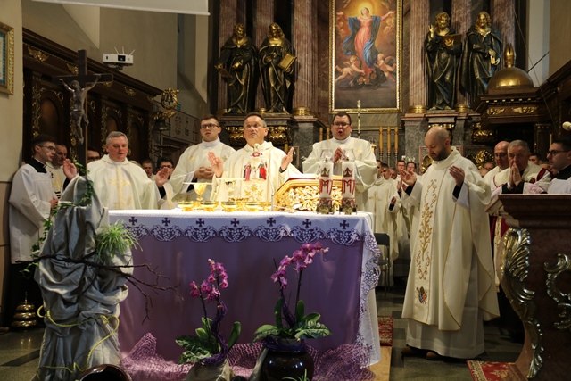 Mszy św. przewodniczył generał zakonu paulinów z Jasnej Góry o. Arnold Chrapkowski. Kustosz kaliskiej bazyliki ks. prał. Jacek Plota witając głównego celebransa podkreślał, że istnieje wiele wątków mówiących o ścisłej więzi Jasnej Góry z Kaliszem. Spośród nich wymienił o. Augustyna Kordeckiego urodzonego w Szczytnikach, najstarszą pieszą pielgrzymkę „Od Józefa do Maryi i od Maryi do Józefa”, czy współcześnie powołanie o. Łukasza Buzuna, ówczesnego przeora Jasnej Góry na biskupa pomocniczego diecezji kaliskiej. Kustosz przypomniał, że dziś mija szósta rocznica inauguracji pontyfikatu Papieża Franciszka, który jako wierny czciciel św. Józefa ofiarował złoty pierścień dla św. Józefa Kaliskiego i podniósł kaliskie sanktuarium do godności Narodowego Sanktuarium Św. Józefa.