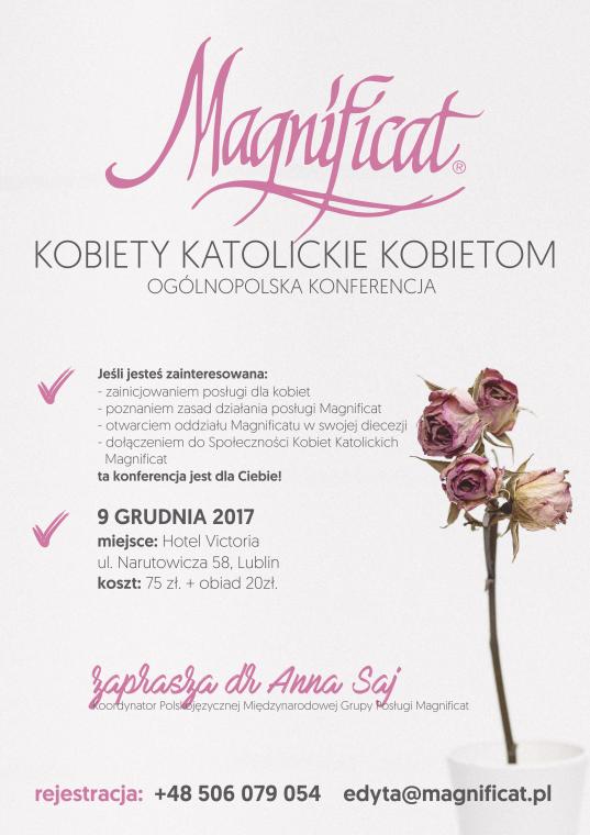 W Polsce funkcjonuje już kilka oddziałów Magnificatu. Najstarszy to odział Lubelski Matki Bożej Anielskiej. Kilka oddziałów zaczyna właśnie swoją formację. Jest też kilka grup zainteresowanych tą metodą. Odpowiadając na potrzebę formacji, ale także widząc coraz większą potrzebę budowania środowiska dla katoliczek, które będzie miejscem wsparcia, zachęty i budowania relacji powstał pomysł Konferencji Magnificat – Kobiety Katolickie Kobietom, która odbędzie się 9 grudnia br. w Lublinie. Organizatorki wierzą, że będzie to czas wymiany darów, ponieważ każda uczestniczka, będzie ze sobą wnosić to, co Bóg w niej złożył. Będzie to również czas rozmów tych w kuluarach, ale też podczas panelu, którego tematem będzie: Rola Kobiety w Kościele. Wezmą w niej udział: Magdalena Buczek (założycielka Podwórkowych Kółek Różańcowych), Anna Weigl (wraz z mężem założyła chrześcijańską szkołę podstawową, gimnazjum, przedszkole a ostatnio żłobek, a oprócz tego jest liderem uwielbienia we wspólnocie Chefsiba), Sylwia Wilk (wraz z mężem prowadzi rekolekcje w całej Polsce, a także za granicą), Alicja Dziemian (liderka wielopokoleniowej wspólnoty Odnowy w Duchu Świętym Getsemani w Suwałkach) oraz dr Anna Saj (teolog, w 1997 r. zapoczątkowała w Polsce Posługę Kobiet Katolickich Magnificat, wraz z mężem są koordynatorami Instytutu Ewangelizacji Świata ICPE Misja Polska). Częścią Konferencji będzie wieczorny Magnificat, podczas którego świadectwo powie Sylwia Wilk.