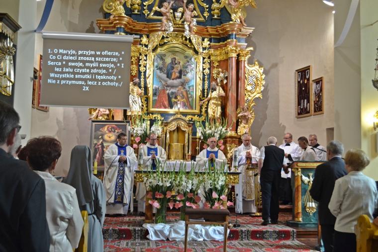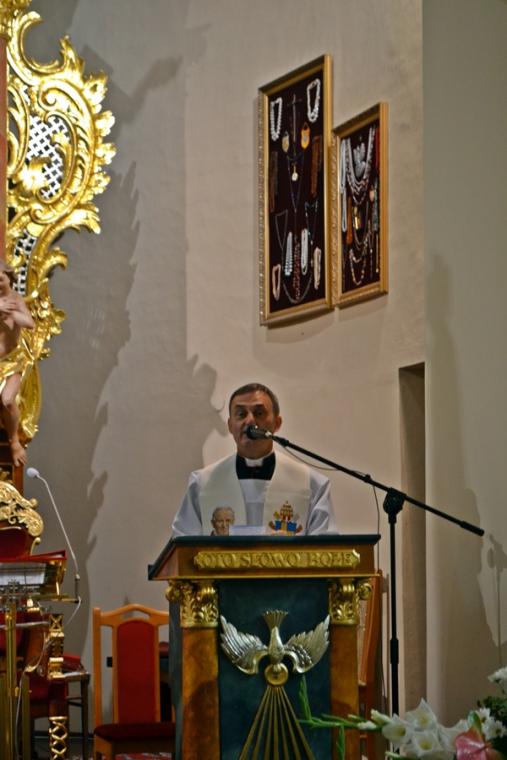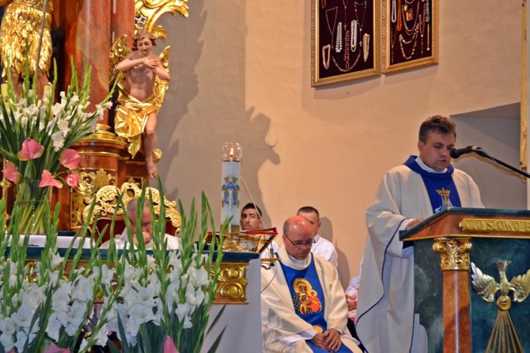 Przed rozpoczęciem Eucharystii słowa podziękowania za przybycie skierował do zebranych w sanktuarium ks. kan. Adam Kosmała. Zachęcał wiernych do przedstawiania Maryi swoich próśb o potrzebne łaski. Podziękował parafianom za przygotowanie kościoła do uroczystości odpustowych, podkreślając, że to dzięki ich zaangażowaniu prezentuje się on tak pięknie. Po odsłonięciu obrazu rozpoczęła się suma odpustowa. Sumę odpustową koncelebrowało czterech kapłanów. Koncelebrze przewodniczył ks. kan. Jacek Stawik, proboszcz parafii Jaraczewo. Współcelabransami byli ks. kan. Krzysztof Ordziniak, ks. kan. Przemysław Talaga i ks. Paweł Wczesny. W czasie sumy homilię wygłosił ks. kan. Jacek Stawik. Rozpoczynając podkreślił, że lektura Pisma Świętego pokazuje,że Pan Bóg chce na ziemi miejsc, w których będzie szczególnie obecny, w którym będą gromadzili się wierni jako lud, jako bracia, jako rodzina. Zaakcentował, że takim miejscem jest Kotłowskie Wzgórze. Przyznał, że sam to miejsce dopiero odkrywa. Podzielił się swoimi lękami, niepokojami związanymi ze wspomnieniami z początków podziału kościoła. Przyznał, że bał się tego miejsca, a jak podkreślił jest ono piękne, przepełnione miłością, bo jest domem Matki. Tutaj, jak podkreślił czcimy Ją, pozdrawiamy, ale także poznajemy, doświadczamy, że Jej życie miało głęboki sens, zostało uhonorowane chwałą nieba i przebywaniem przy Bogu. Nawiązując do przeżywanej uroczystości kaznodzieja przypomniał, że w liturgii wspominamy dzień narodzenia Maryi. Kontynuując powiedział: „ Liturgia jest czymś niezwykłym. Jest działaniem Boga i naszym. My się gromadzimy mając dobrą wolę, coś czytamy, mówimy, wykonujemy biblijne gesty, a Bóg działa i czyni obecnym to wszystko co się już wydarzyło. Dodał, że liturgia dnia dzisiejszego przenosi nas w dzień narodzin, który jest dniem radości i wielkiego szczęścia. Ks. kan. Jacek zaakcentował, że Maryja była jutrzenką, czyli Tą, która poprzedza słońce, Tą, która porodzi Zbawiciela. Nawiązując do słów Ewangelii- rodowodu Jezusa Chrystusa podkreślił, że jest w nim wiele ważnych, cennych informacji. Zawiera on tajemnice powołania. Zwrócił uwagę, że współczesny człowiek żąda świata idealnego. Okazuje się jednak, że w opisie rodowodu Jezusa nie występują osoby, które wcale nie były idealne, nie były święte. Podkreślił, że na początku i na końcu opisu rodowodu są osoby święte: Abraham, którego wiara jest dla nas wzorem i Maryja. Kontynuując kaznodzieja zwrócił uwagę, że my także wpisujemy się w ten rodowód, gdyż Zbawca ciągle się objawia. Ks. kan. Jacek zachęcał zebranych, by podjęli refleksję nad tym jak wpisują się w ten rodowód. Dodał, że dobrze będzie zapytać Maryi, jak wpisać się w ten rodowód. Podkreślił, że Maryja prowadziła proste, zwyczajne życie, w które wpisana była pokora, radości, cierpienia. Jej życie przepełnione było szacunkiem i miłością do Józefa. Kontynuując kaznodzieja podkreślił, że prawdziwym pięknem Maryi jest prawda. Powiedział: „ Bóg jest Bogiem, Ona jest człowiekiem. Wie, że wszystko pochodzi od Boga. Jest pokorną służebnicą”. Zwrócił uwagę, że źródłem Jej piękna było słowo Boże, które rozważała, którego słuchała i które przyjmowała i realizowała w swoim życiu. W dalszej części homilii celebrans z naciskiem podkreślił, że Bóg jest w niebie, nikt z nas nie jest Bogiem. Skierował do zebranych w świątyni pytanie jak ta prawda, że Bóg jest tylko jeden porządkuje ich życie. Tą prawdą- jak podkreślał żyła Maryja, dlatego powinniśmy się Nią zachwycać. Kontynuując powiedział: „Ciągle jesteśmy na jakimś rozdrożu, jesteśmy karmieni różnym rzeczami, różnymi sprawami. Jesteśmy nieraz karmieni dziełami ciemnymi, wypalonymi, pustymi. Stąd wiele beznadziejności”. Podkreślił, że czasy współczesne są największym kryzysem cywilizacyjnym. Zaakcentował, że człowiek współczesny ma tendencję do urządzania świata na nowo, odrzucając Pana Boga. Kontynuując dodał, że jesteśmy uwikłani w ten kryzys cywilizacji i nie pozostaje on bez wpływu na nasze życie. Podkreślił, że fakt iż jesteśmy u Matki Bożej wskazuje, że kroczymy drogą prawdziwą, tą, która zaprowadziła Maryję do królowania w niebie.