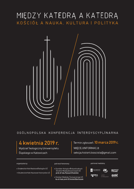 Studenckie Koło Naukowe Teologów oraz Studenckie Koło Naukowe Historyków Uniwersytetu Śląskiego mają zaszczyt zaprosić na Ogólnopolską Konferencję Interdyscyplinarną pt. „Między katedrą a katedrą. Kościół a nauka, kultura i polityka”, która odbędzie się w budynku Wydziału Teologicznego UŚ w Katowicach w dniu 4 kwietnia 2019 r.