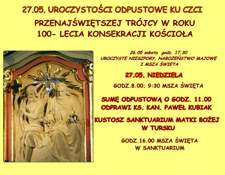 Uroczystości odpustowe rozpoczniemy już w sobotni wieczór 26. maja o godz. 17.30 uroczystymi nieszporami, nabożeństwem majowym i Eucharystią.