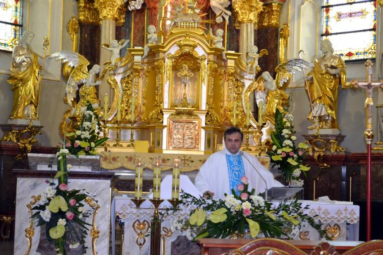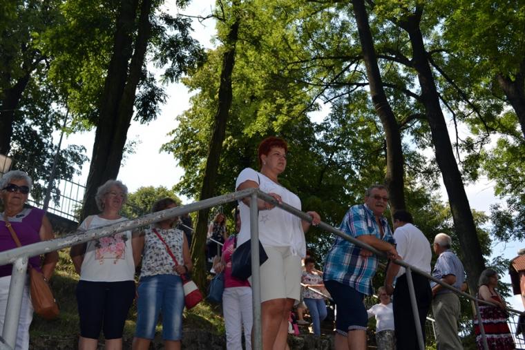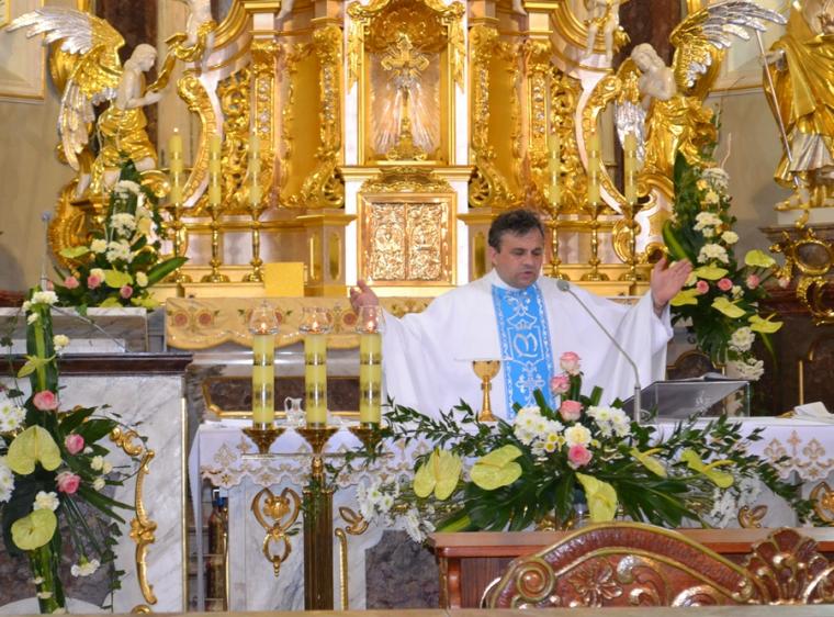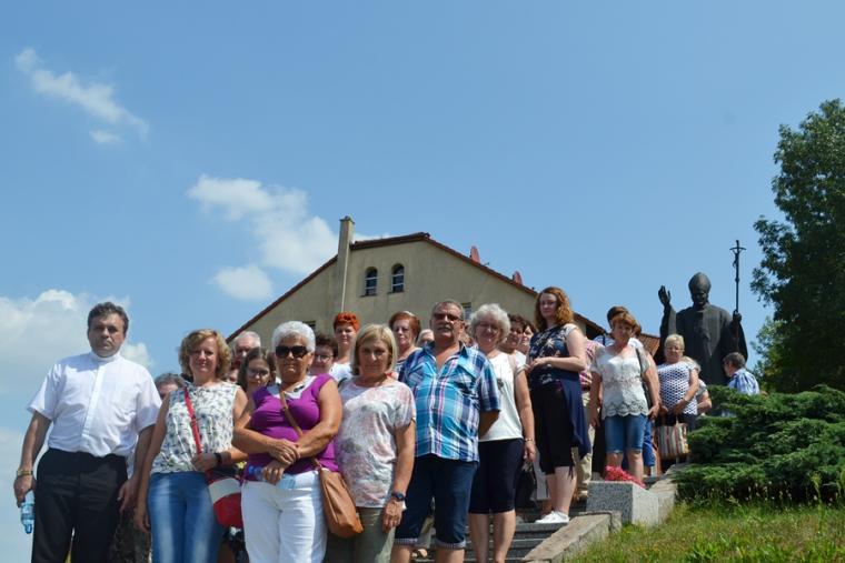 Następnie udaliśmy się na Górę Świętej Anny. Czekała tam na nas Babcia Jezusa, jej córka Maryja i Boski wnuk Jezus. Chociaż właściwie powinniśmy wymienić ich w odwrotnej kolejności, bo Anna Samotrzecia w swojej figurze pokazuje nam właśnie na Jezusa i Maryję. Ona sama stoi tuż za nimi. Po przybyciu na Górę Świętej Anny udaliśmy się do bazyliki. Stąd po przywitaniu i modlitwie udaliśmy się do Groty Lourdzkiej. Był czas na nawiedzenie kapliczek kalwaryjskich i indywidualną modlitwę w bazylice. Każdy z nas wyruszał na pielgrzymi szlak chcąc przedstawić przez wstawiennictwo świętych Bogu swoje intencje. Ważny był zatem ten czas na indywidualną modlitwę. O godzinie 14:30 w bazylice św. Anny przeżywaliśmy najważniejsze wydarzenie pielgrzymkowego dnia- Eucharystię. Sprawował ją we wszystkich naszych intencjach ks. proboszcz Krzysztof Ordziniak. Rozpoczynając mszę świętą podkreślił, że przybyliśmy na tę Górę, by uczcić świętą Annę matkę Maryi i babcię Jezusa, by jej powierzyć nasze radości i troski. W rozważaniu ks. kan. Krzysztof przypomniał, że pielgrzymowaliśmy do trzech Świętych. Nasz pielgrzymi szlak rozpoczęliśmy od Dobrzenia i spotkania ze św. Rochem, który patronuje naszemu miastu, następnie był Kamień Śląski i spotkanie ze św. Jackiem. Wreszcie dotarliśmy na Górę Świętej Anny. Podkreślił, że chronologicznie trasa naszego pielgrzymowania powinna rozpocząć się na Górze Świętej Anny. Zaznaczył, że Biblia nie przekazuje nam informacji o Annie i Joachimie, ale wiadomo, że długo oczekiwali na Maryję. Zwrócił uwagę, że podobnie było w życiu rodziców naszego niebieskiego Patrona, którzy uprosili sobie potomka właśnie za wstawiennictwem Maryi. Kontynuując ks. kanonik zaakcentował, że rodzice Maryi musieli być ludźmi świętymi, skoro przekazali życie tej, która zrodziła Zbawiciela. Podkreślił, że Maryja była służebnicą Pańską, tą, która potrafiła bezgranicznie zaufać Bogu. Zapewne tego zaufania uczyła się w domu, od swoich rodziców. Kaznodzieja zwrócił uwagę, że św. Anna jest tą, która uczy nas zaufania. Zachęcił, byśmy będąc w tym szczególnym miejscu prosili o umiejętność zaufania Bogu. W dalszej części rozważania ks. kan. Krzysztof prosił św. Annę, by w sposób szczególny wspierała tych, którzy są babciami i dziadkami, od których wiele zależy. Podkreślił jednocześnie, że ich rola we współczesnym świecie jest trudna, gdyż młodzi nie zawsze chcą przyjmować ich wskazania. Celebrans zwrócił uwagę na znaczenie modlitwy. Kończąc przywołał słowa pieśni śpiewanej często w sanktuarium: „Niech się co chce ze mną dzieje, w Tobie święta Anno, mam nadzieję”. Są one, jak podkreślił, wyrazem naszego zaufania do św. Anny. Przed końcowym błogosławieństwem ks. kan. Krzysztof odmówił modlitwę pielgrzyma przez wstawiennictwo św. Anny.