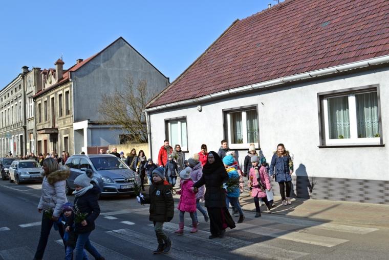 Młodsi zebrali się o godz. 10:50 przy figurze Serca Jezusowego na Rynku. Tu ks. wikariusz Krzysztof odczytał fragment Ewangelii opisujący wjazd Jezusa do Jerozolimy, następnie odmówił modlitwę i pobłogosławił przyniesione przez wiernych, głównie dzieci palmy. Po pobłogosławieniu palm zebrani na rynku udali się procesjonalnie do kościoła, gdzie ks. wikariusz Krzysztof Lipiński wraz z ks. kan. Grzegorzem Klapą sprawowali Eucharystię. W słowie skierowanym do zebranych w mikstackim wieczerniku ks. wikariusz podkreślił znaczenia dla wierzących nadchodzących dni Triduum Paschalnego. Zachęcał do uczestnictwa w nim zarówno dorosłych, jak i dzieci. W słowach skierowanych do rodziców zwrócił uwagę, że to na nich spoczywa obowiązek wyjaśnienia dzieciom znaczenia Triduum Paschalnego. Podkreślił, że najlepiej można to uczynić biorąc wspólnie w nim udział. Trudno jest wyjaśnić, opowiedzieć – jak powiedział jego istotę.