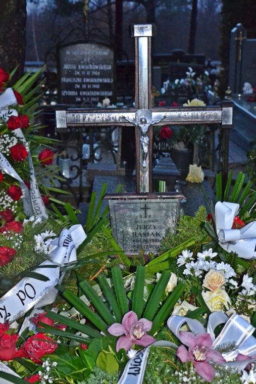 Po błogosławieństwie nadszedł czas na wspomnienia i słowa pożegnania zmarłego kapłana - Syna mikstackiej parafii. Słowa podziękowań i wspomnień zostały wypowiedziana przez Burmistrza Miasta i Gminy Mikstat Henryka Zielińskiego, europosłankę Beatę Kempę. Słowa pożegnania wygłosił przybyły z Wrocławia ks. dr Jerzy Żytowiecki reprezentujący ZHR. W uroczystości pogrzebowej uczestniczyły dwa poczty sztandarowe harcerzy. W homilii bp Ignacy zaznaczył, że śp. ks. kan. Jerzy aktywnie działał w drużynie harcerskiej. Następnie głos zabrał kanclerz kurii legnickiej ks. Józef Lisowski. W imieniu kapłanów pochodzących z parafii mikstackiej współbrata w kapłaństwie pożegnał ks. Ryszard Zieliński. Jak mogliśmy usłyszeć w homilii jedną z największych zasług ks. kan. Rasiaka było utworzenia Ośrodka Dokumentacji Kurii Metropolitalnej. Współpracownicy ks. kan. Jerzego przybyli do Mikstatu, by odprowadzić go na miejsce wiecznego spoczynku. W ich imieniu zabrał głos Dominik Mas. Początki pracy i otwartość śp. ks. kan. Jerzego na pomysły współpracowników, jego życzliwość, serdeczność podkreślał w swoim wspomnieniu i pożegnaniu Andrzej Baworowski, pełnomocnik zarządu ds. dziedzictwa historycznego. Na zakończenie tej części uroczystości głos zabrały bratanice ks. kan. Jerzego - Magdalena Maj i Anna Rasiak. Po obrzędzie ostatniego pożegnania kondukt żałobny wyruszył w kierunku cmentarza parafialnego. Ostatnia droga śp. ks. kan. Jerzego przebiegała tak dobrze znanymi ulicami miasta. W homilii kaznodzieja wspominał, że ks. kan. Jerzy był upowszechniał kult św. Rocha. Mikstacki cmentarz otacza Diecezjalne Sanktuarium Świętego Rocha. Miejsce spoczynku znajduje się nieopodal tego sanktuarium. Zanim trumna z ciałem spoczęła w grobie zabrał głos ks. kan. Krzysztof Ordziniak, kustosz Diecezjalnego Sanktuarium Świętego Rocha w Mikstacie, który podziękował śp. ks. kan. Jerzemu za troskę o rozwój kultu św. Rocha, za zainteresowanie tym, co się wokół tego kultu i sanktuarium dzieje. Wyraził nadzieję, że zmarły kapłan będzie wspierał swoim orędownictwem przed Panam dalsze działania podejmowane na rzecz rozwoju tego kultu.