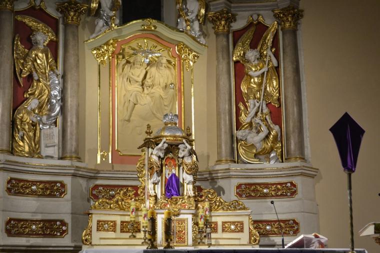 Po zakończonej Mszy Świętej, przy wystawionym Najświętszym Sakramencie zostało odprawione nabożeństwo ku czci Trójcy Świętej. Rozpoczęła je modlitwa nowennowa. To drugi miesiąc naszego trwania na Nowennie do Trójcy Świętej. Następnie odmówiona została Koronka. Ku niebu wraz z wonią kadzidła popłynęło wołanie: „Święty, Święty, Święty Pan Bóg zastępów. Pełne są niebiosa i ziemia chwały Twojej” na uwielbienie Trójcy Świętej, Ojca, Syn, Ducha Świętego. Była także okazja do tego, by w ciszy swego serca wypowiedzieć dziękczynienie. Po Koronce do Trójcy Przenajświętszej odmówiliśmy litanię. Błogosławieństwo Najświętszym Sakramentem zakończyło nabożeństwo. O zbliżających się obchodach przypomina nam baner umieszczony nad bramą wejściową do świątyni.