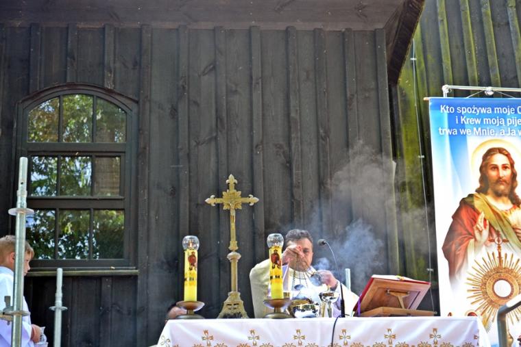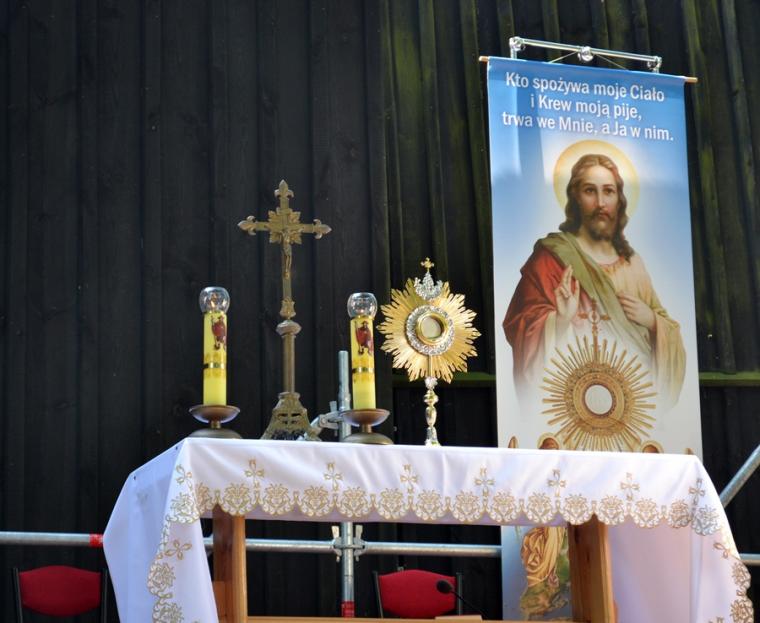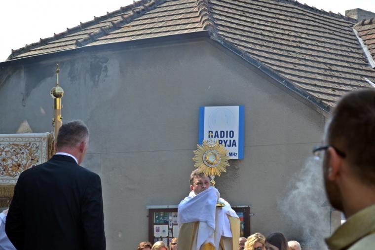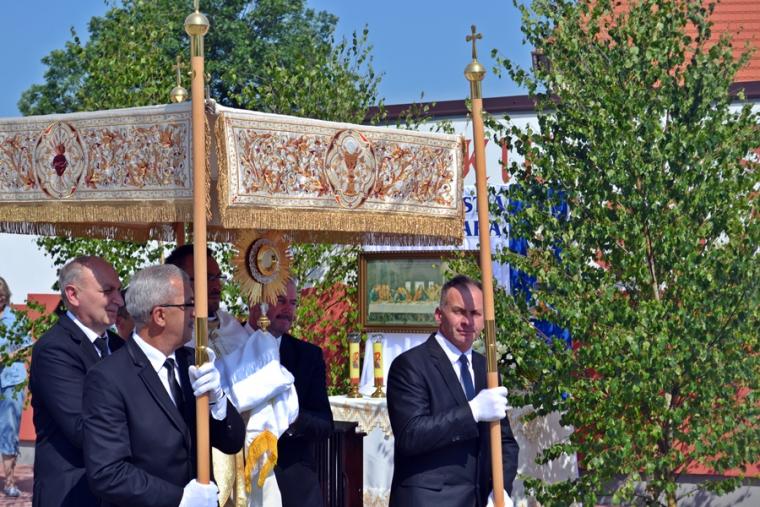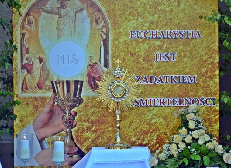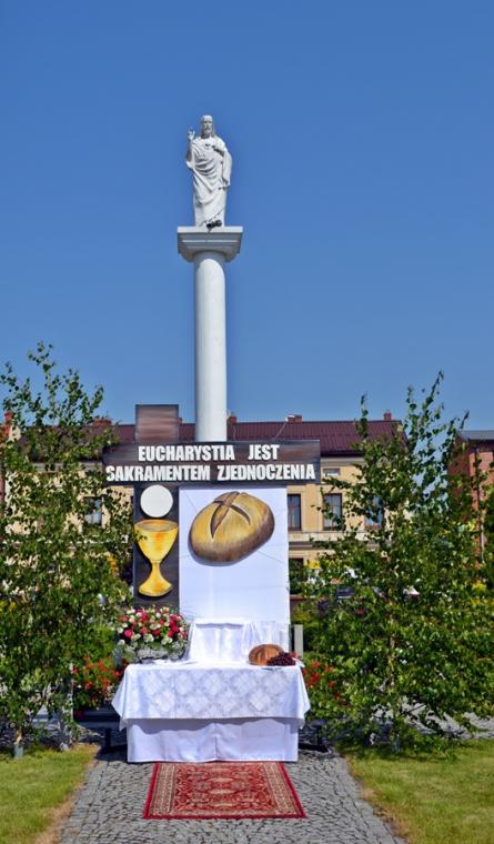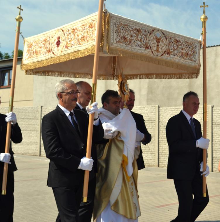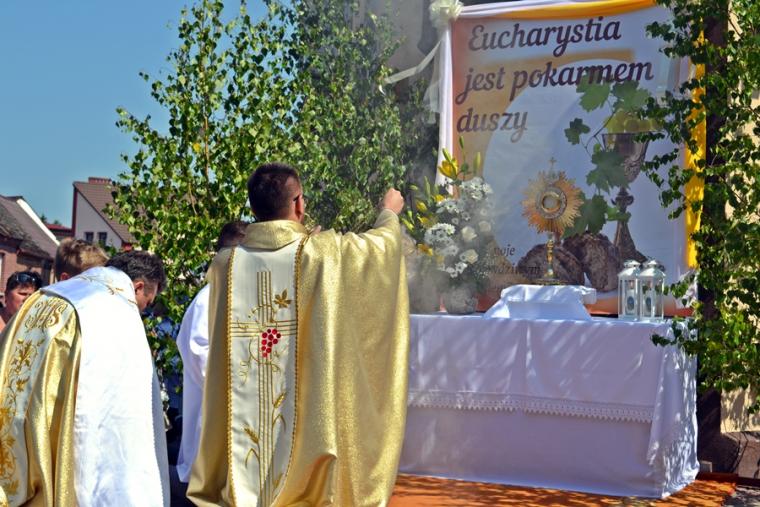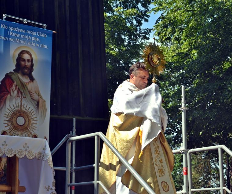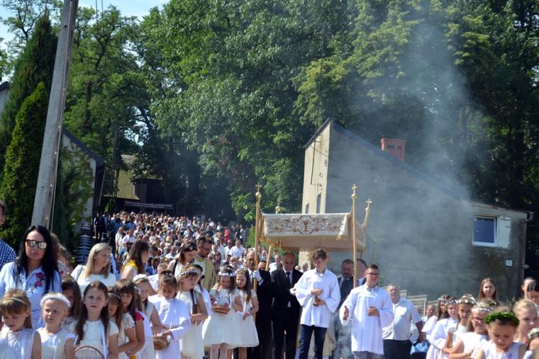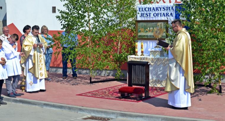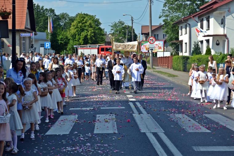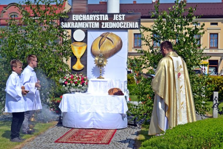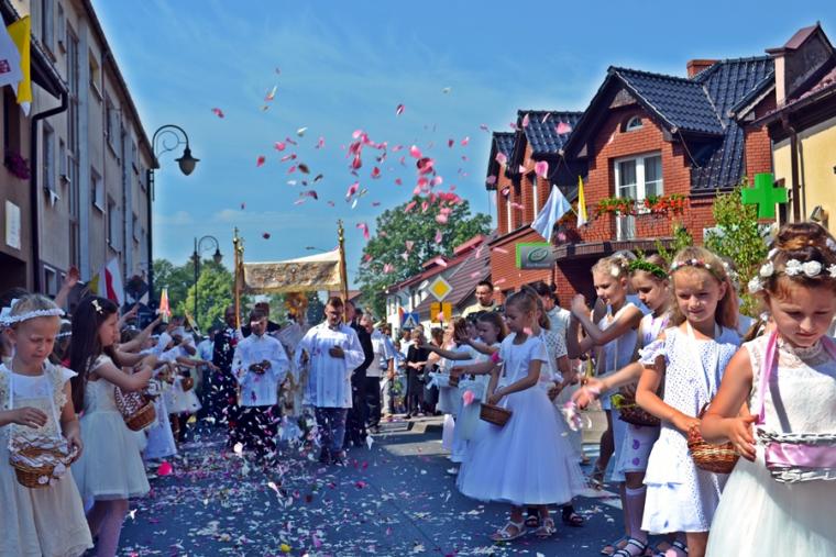 Wracając do głównego wątku rozważania kaznodzieja zachęcał wiernych do postawienia sobie pytania: „Co Jezus ukryty pod postacią Chleba, zobaczy w czasie wędrowania przez nasze miasto i parafię? Jaką zobaczy Ojczyznę, jaki Kościół, jaką rodzinę, jakiego człowieka?”. W dalszej części homilii celebrans podkreślił, że uroczystość Bożego Ciała jest wielkim pokłonem złożonym Jezusowi, ale jednocześnie zachęcał, by odpowiedzieć sobie na pytanie, czy zawsze oddajemy Bogu pokłon. Zaznaczył, że różnie z tym bywa. Myślą przewodnią rozważania były słowa pieśni „ Zróbcie Mu miejsce…”. Kończąc rozważanie ks. kanonik powiedział: „ Mam do Was ogromną prośbę w tym roku, abyśmy zrobili Bogu miejsce w naszych kalendarzach, które są tak mocno zapełnione różnymi sprawami”. Parafia podzielona jest na rejony, jak podkreślił ks. proboszcz nie tylko po to, by wywiązywały się one m.in. z organizacji procesji w poszczególnych dniach, ale i po to, by ich mieszkańcy w tych dniach uczestniczyli w Eucharystii. Jak odpowiemy na to zaproszenie? Czy zrobimy miejsce dla Pana w naszych sercach i w naszych kalendarzach. Tak wielu z nas przyjęło Jezusa w Komunii Świętej. Zrobiliśmy Mu miejsce w naszych sercach. Po Mszy Świętej odbyło się wystawienie Najświętszego Sakramentu, następnie wraz z Jezusem ukrytym pod postacią Chleba wyruszyliśmy w procesji do czterech ołtarzy. Przedstawiciele poszczególnych regionów przygotowali ołtarze. Trasa tegorocznej procesji wiodła od Diecezjalnego Sanktuarium Świętego Rocha do krzyża misyjnego przy naszej farze, której 100- lecie konsekracji przeżywać będziemy w październiku. Jak to już staje się tradycją w naszej wspólnocie co roku procesja odbywa się inna trasą, bo Jezus przychodzi do wszystkich. Przy poszczególnych ołtarzach wsłuchiwaliśmy się w rozważania, których myślą przewodnia była EUCHARYSTIA. Na pierwszym ołtarzu znajdowało się hasło: Eucharystia jest Ofiarą. W słowach rozważania usłyszeliśmy m.in. „ W opisie Eucharystii bardzo ważne są cztery czasowniki: brać, błogosławić, łamać, dawać. Dzięki nim możemy zaobserwować, na czym polega logika ofiary Jezusa”. O tym jak wielka jest tajemnica Boga i o Eucharystii jako pokarmie dla duszy mowa była w rozważaniu przy drugim ołtarzu. Na trzecim ołtarzu widniało hasło: „Eucharystia jest sakramentem zjednoczenia”. Tu do wiernych popłynęło przesłanie: „ Ten, który pokonał śmierć może wejść pomimo drzwi zamkniętych, pomimo zakrytych bielmem oczu i zatwardziałych serc. Wówczas, gdy On wychodzi nam naprzeciw , ukazuje się jako żyjący, dający życie”. Hasło na trzecim ołtarzu zachęcało nas do spojrzenia na Eucharystię jako zadatek nieśmiertelności. Tu wybrzmiało także Te Deum laudamus. Procesję zakończyło błogosławieństwo Najświętszym Sakramentem na cztery strony świata. Podczas procesji niesione były sztandary i feretrony. Uroczystość uświetniła orkiestr parafialna i chór. A tuż przed baldachimem kroczyły dziewczęta sypiące kwiatki. Było ich podczas tegorocznej procesji bardzo dużo. Jezus ukryty pod postacią Chleba przemierzał ulice naszego miasteczka obsypywany płatkami kwiatków.