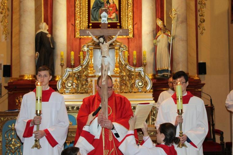 Centralnym wydarzeniem liturgii wielkopiątkowej jest adoracja Krzyża. Ks. kan. Łukasz stopniowo odsłaniając ramiona Krzyża śpiewał trzykrotnie: „Oto drzewo Krzyża, na którym zawisło zbawienie świata”, na co wierni odpowiadali: „Pójdźmy z pokłonem”. Krzyż wystawiony w widocznym i dostępnym miejscu, wierni mogli adorować do godziny 21:00.